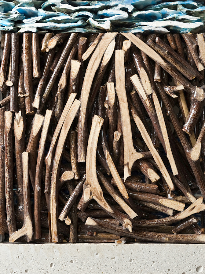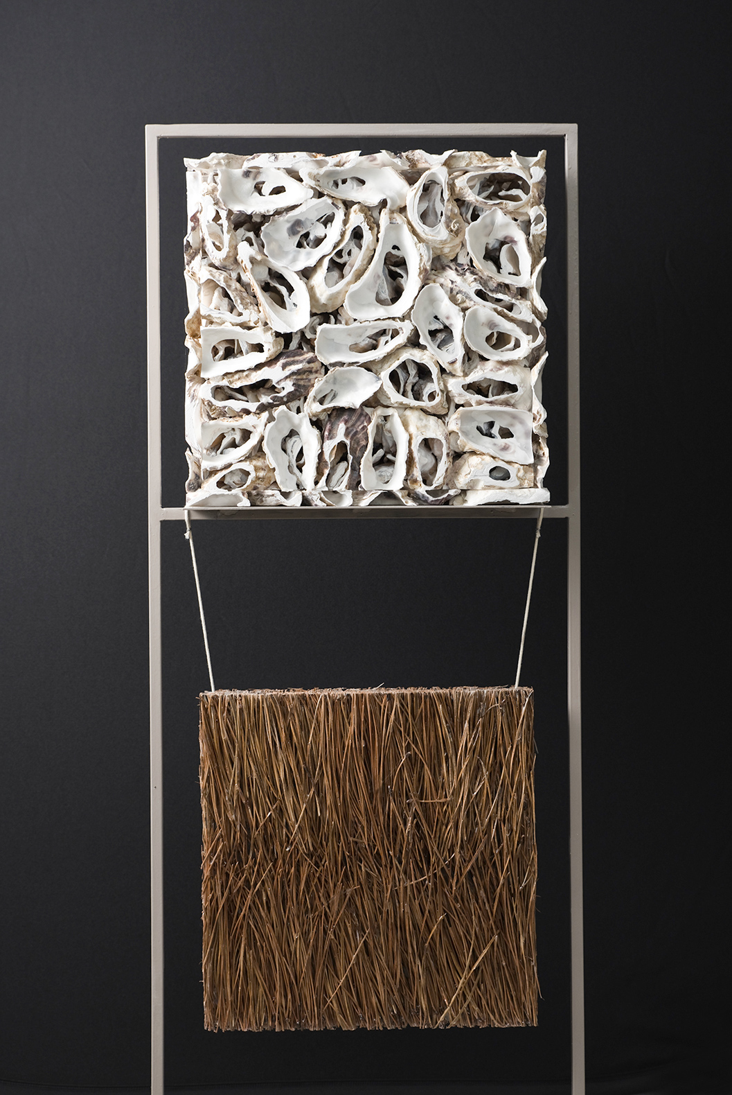 A l’issu d’un repas, son regard gourmand et original s’arrête sur les alvéoles, les pleins et les creux de coquilles d’huîtres… Il y a là la légèreté, les volumes que Jean-Claude qui privilégie désormais une sculpture mosaïque à base de briques, de pierre et de métal cherche comme contrepoint à ces matières brutes et ancrées au sol.