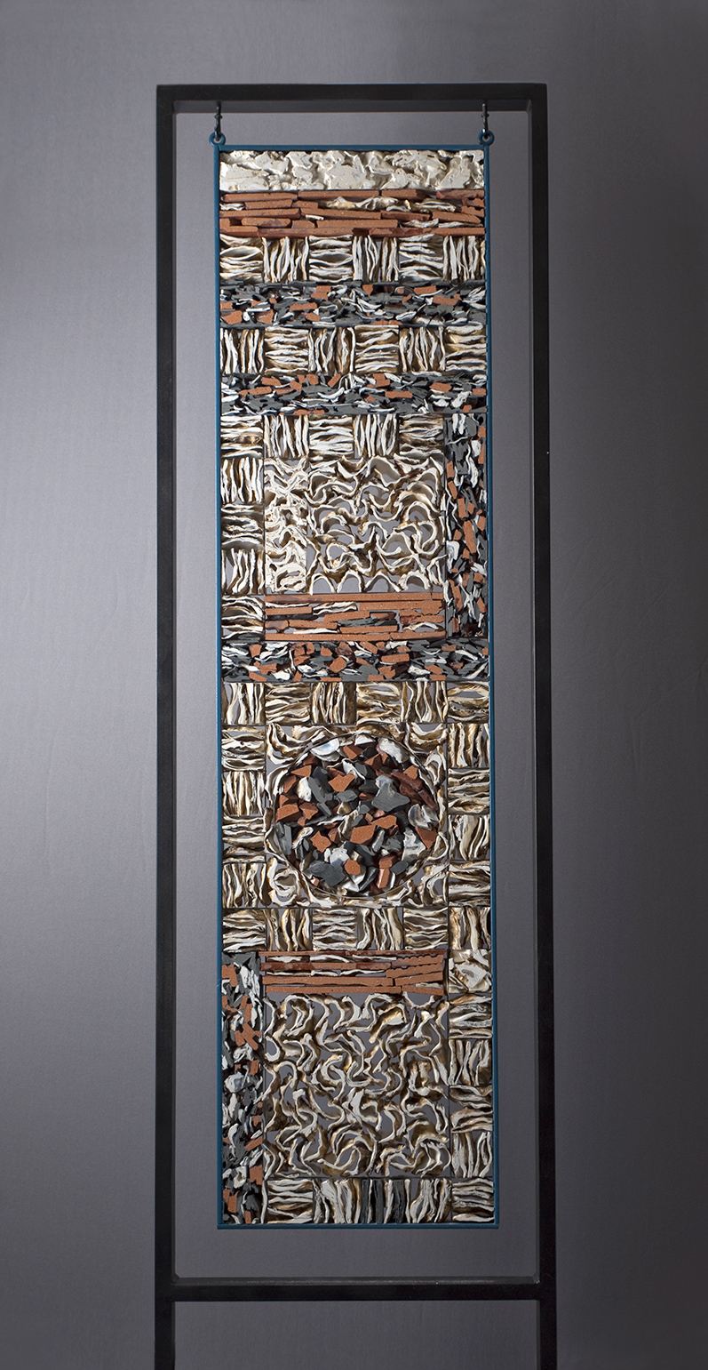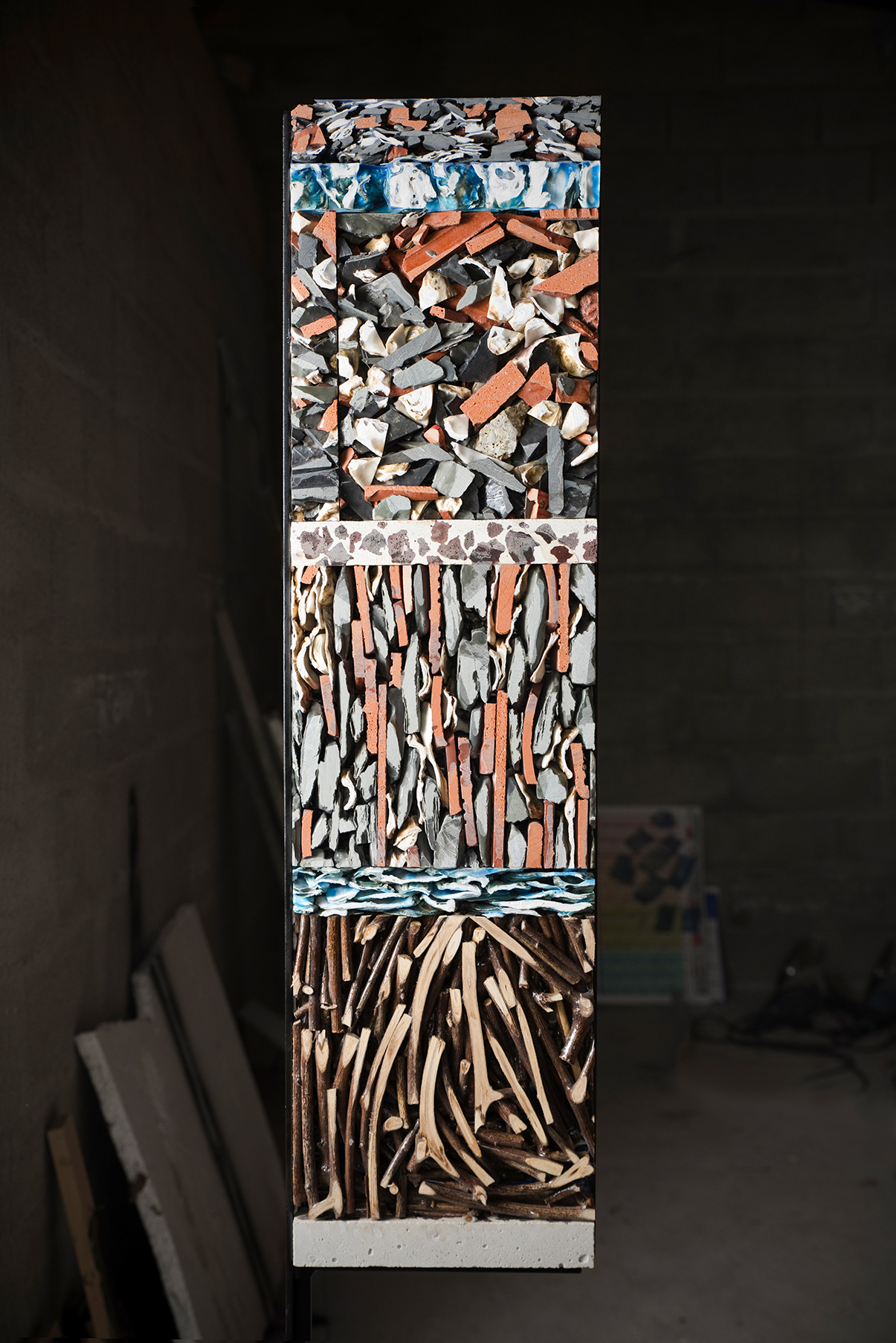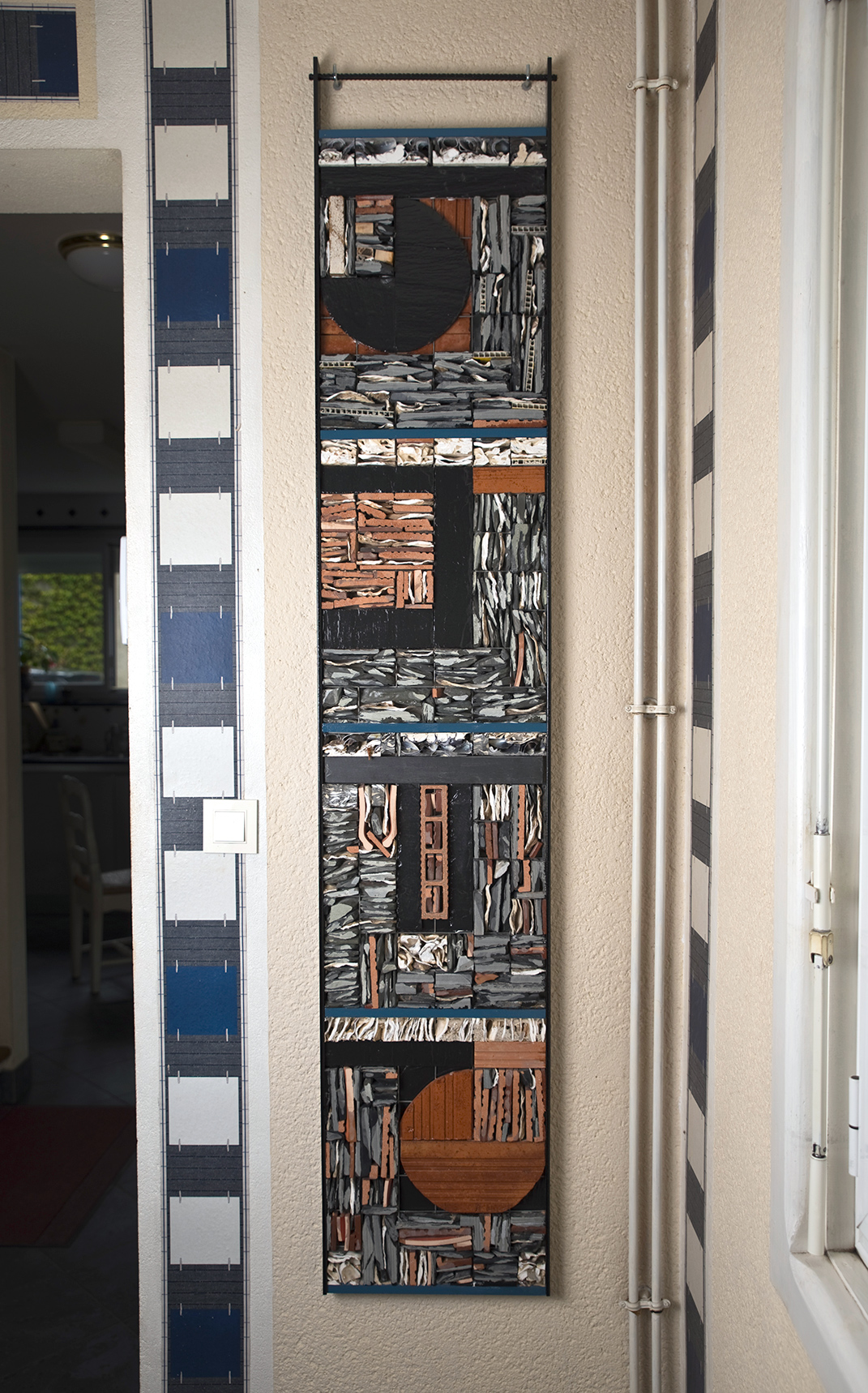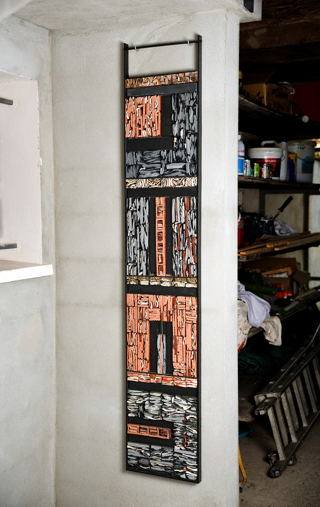 C’est paradoxalement cet incident qui va façonner le profil artistique de Jean-Claude et sa démarche propre. « Avoir les choses sous la main donne à réfléchir autrement » dit-il. Depuis des années en recherche de nouvelles techniques et matières, il avait déjà comme métallier suivi les traces d’un Calder en produisant des mobiles à base d’aluminium et trouve dans le métier du bâtiment des textures, des outils qu’il va détourner sur son temps libre pour créer, composer, oser des mariages inédits où se rencontrent la brique, le métal, le béton et bientôt la matière organique…
